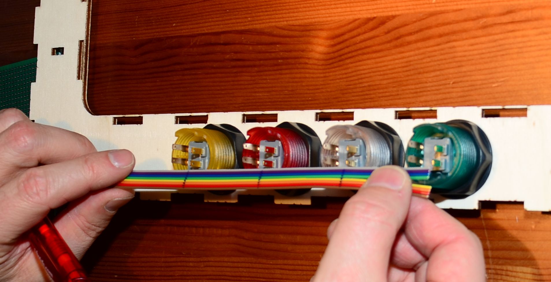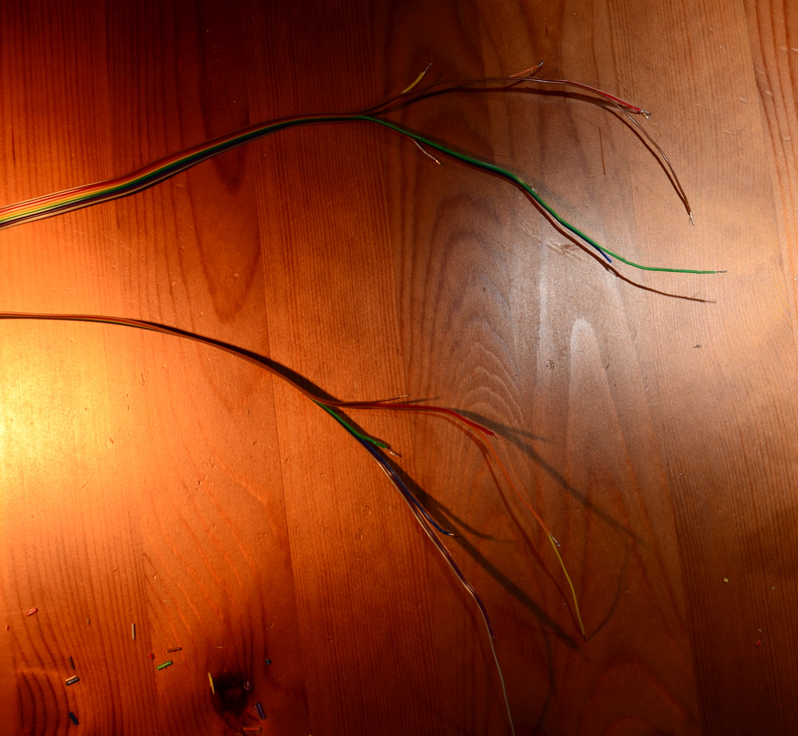 Für die Joysticks müssen analog den Kabelbäumen für die Buttons zwei unterschiedliche lange Kabel (abmessen!) zum Board geführt werden. Die Kabel werden mit female-Steckern versehen. 1-4 sind dabei so lange, dass sie zum Board kommen, 5 ist GND und kann auf den nächsten Ground geführt werden. Für beide Verbindungen Kabel mit female-Steckern versehen.