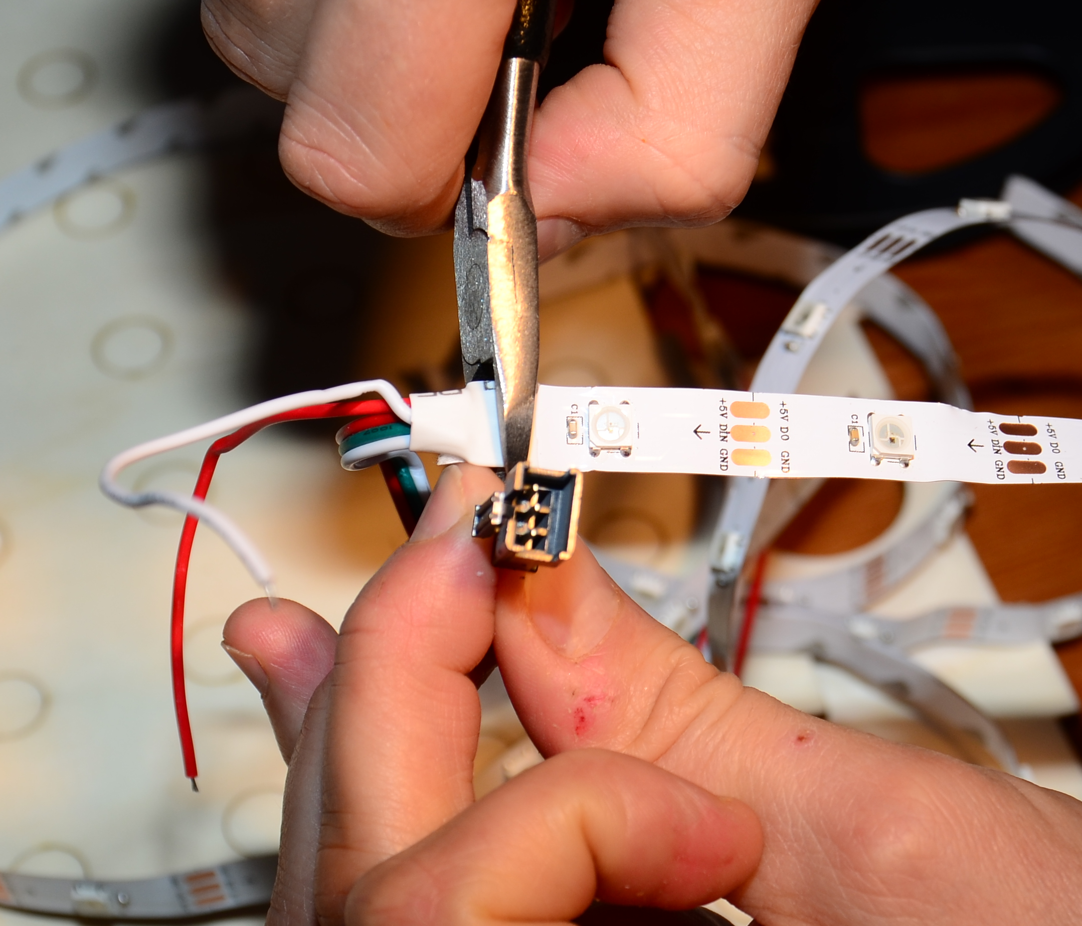 LED Streifen verbinden: Löten auf beiden Seiten. Achtung: Nur Signal DO und DI, grün. (nicht wie auf Bild) | ![]() |