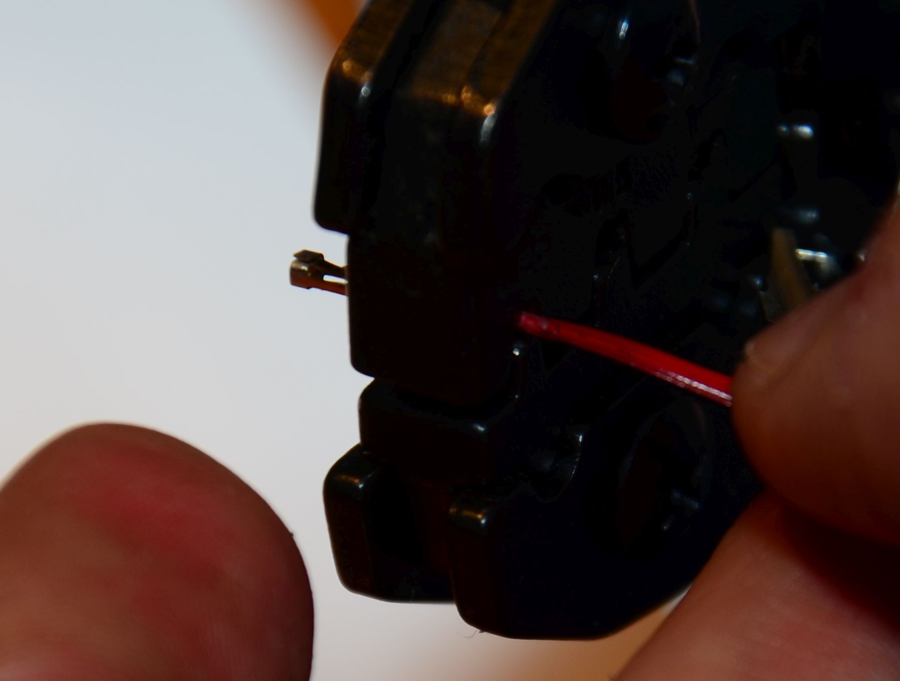 | End-Verkabelung abknippen (Female-Stecker). Freies GND-Kabel (weiss) mit female-Stecker versehen (siehe Abschnitt zu Joystick) | ![]() |