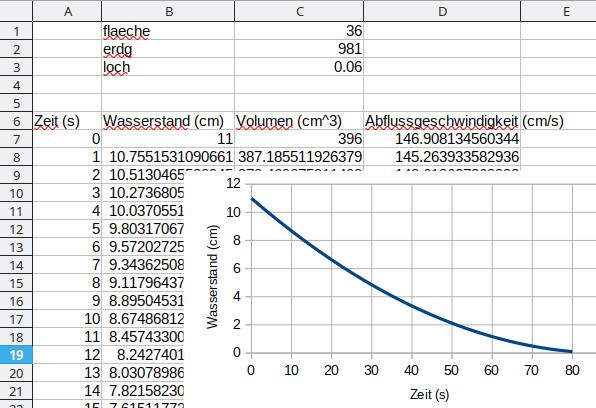 Dabei nehmen wir an, dass die Austrittsgeschwindigkeit des Wasserstrahl jeweils während einer Sekunde konstant bleibt (was natürlich nur angenähert stimmt). Beachten Sie, dass mit der Simulation der Wasserstand negativ werden kann und dann die Berechnung der Wurzel zu einem Fehler führt.