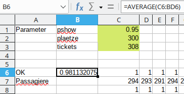 • Die Anzahl tatsächlich erscheinender Passagiere ist die Summe der ersten tickets Zellen. Die Summe über einen variablen Bereich kann mit der Formel =SUM(OFFSET(C8,0,0,tickets,1)) berechnet werden. Wieder Übersetzung auf Deutsch nötig. Dokumentieren Sie die Parameter der OFFSET-Funktion.