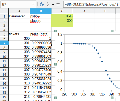 • Die Wahrscheinlichkeit, dass eine binomialverteilte Zufallsvariable einen bestimmten Wert überschreitet kann in Excel berechnet werden: =BINOM.DIST(plaetze,tickets,pshow,1)