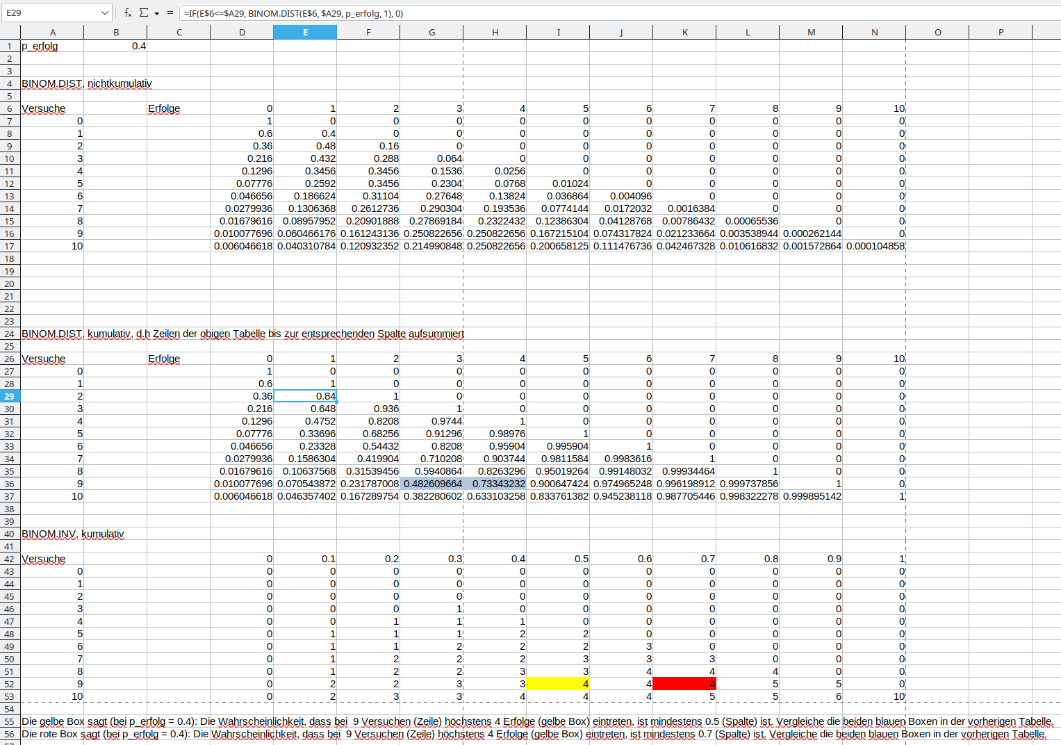 • Zelle E29: =IF(E$6<=$A29, BINOM.DIST(E$6, $A29, p_erfolg, 1), 0)