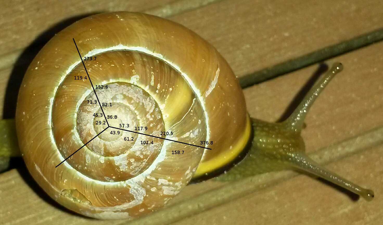 Ersetzen Sie die Kugeln durch dünne Tori, so dass man ins Schneckenhaus hinein sieht. Z.B. so: