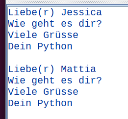 Die Ausgabe soll wieder gut lesbar sein und beispielsweise wie folgt aussehen.