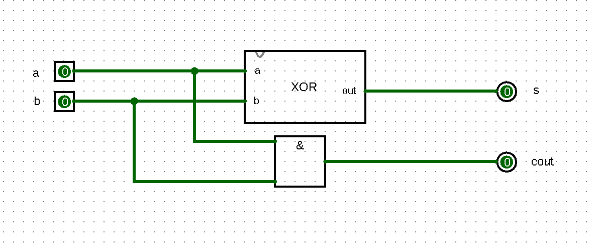 Hier ist die Logisim-Datei für XOR, HA, VA, 4-Bit-Addierer: xor-ha-va-4-bit-addierer-etc.txt