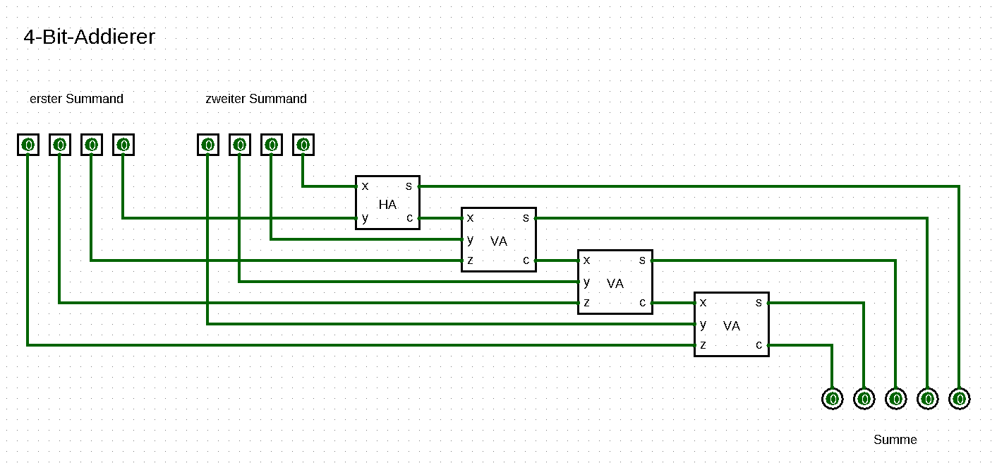 Baue anhand der folgenden Anleitungen einen 4-Bit-Addierer mit Logisim (bitte alles zu Logisim Erklärte sofort selbst ausprobieren; bei den theoretischen Erklärungen gerne mitschreiben):