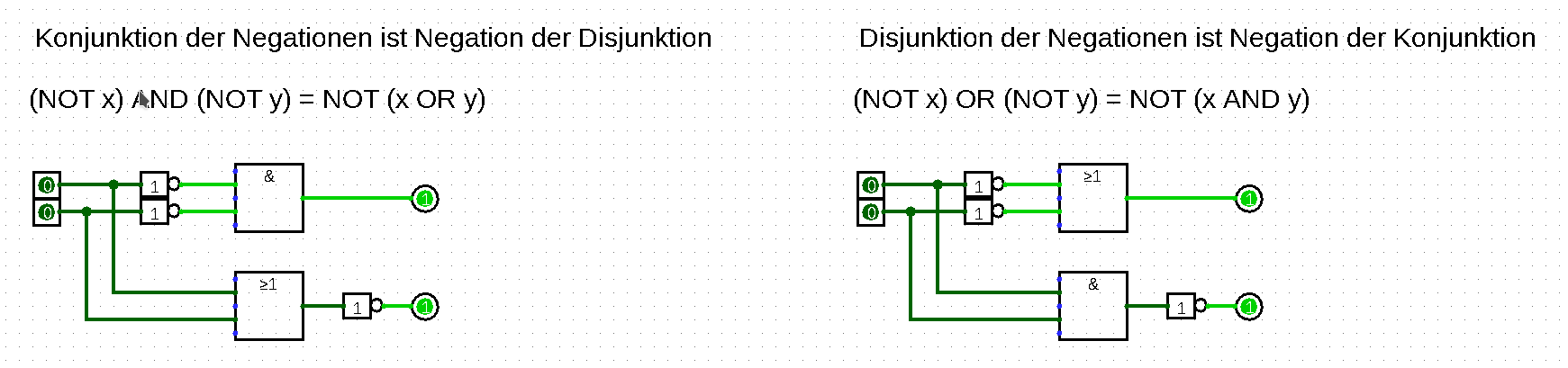 - Ausgänge $\overline{a \wedge b}$, $\overline{a \vee b}$, $\overline{a} \wedge \overline{b}$, $\overline{a} \vee \overline{b}$;