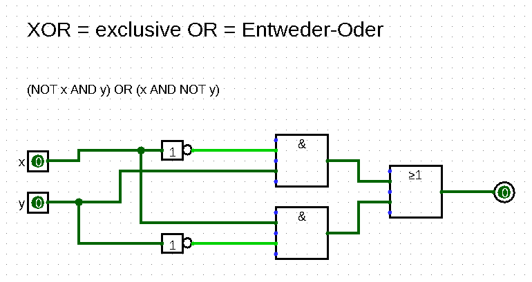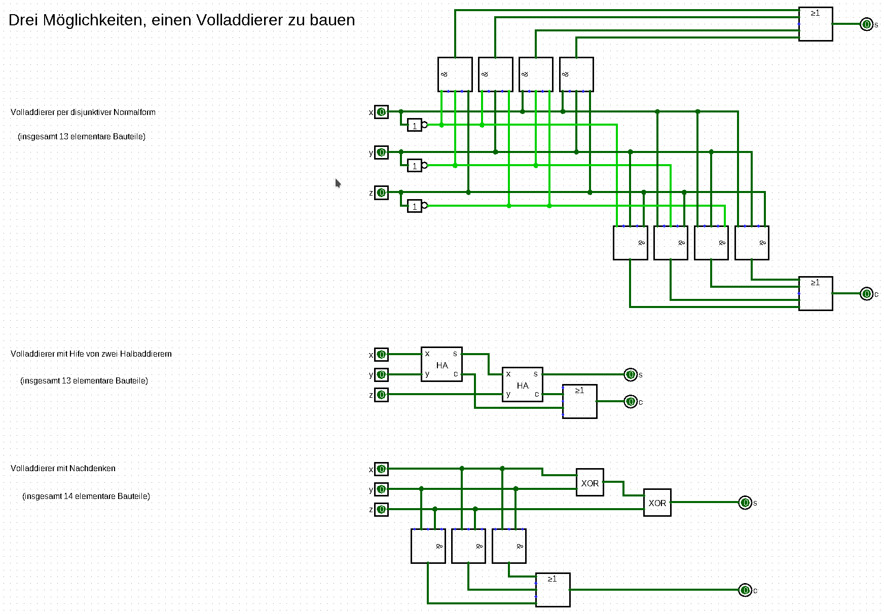 - Statt den Volladdierer per “Disjunktiver Normalform” zu bauen, kann man auch zwei Halbaddierer verwenden, vgl. etwa https://de.wikipedia.org/wiki/Volladdierer#Realisierungen