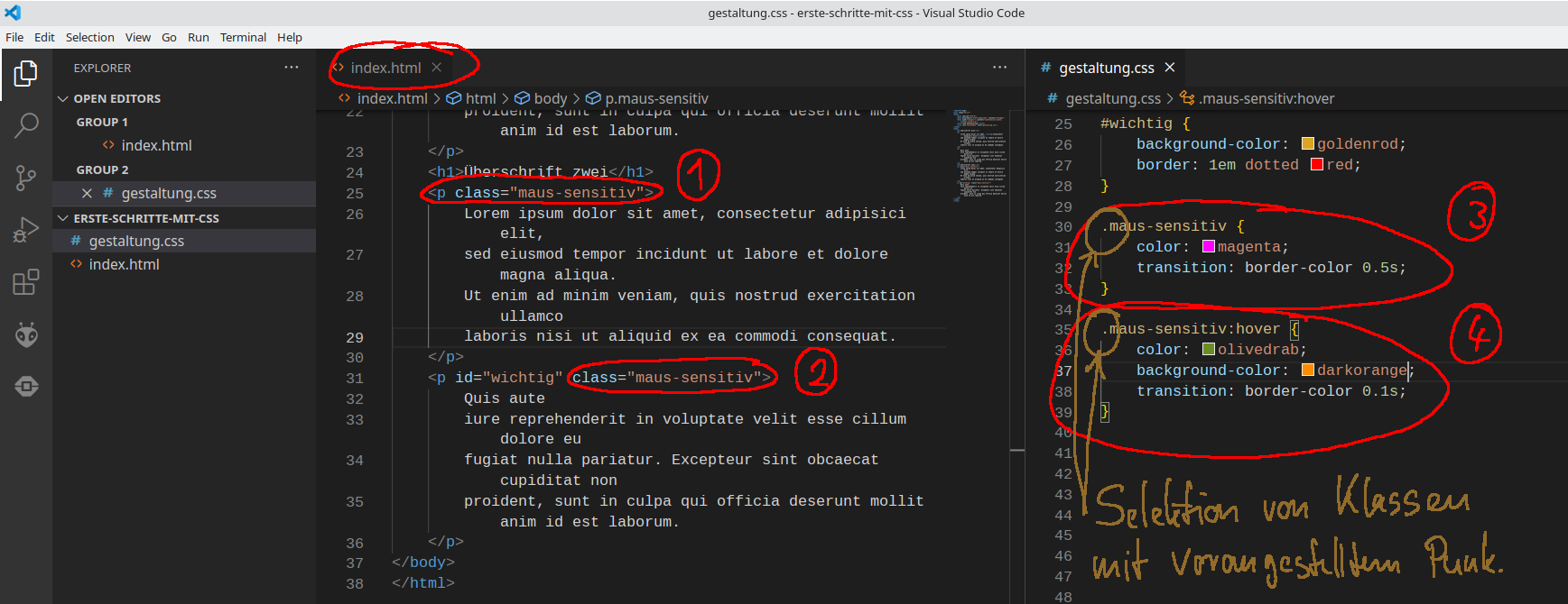 • Stell dir nun vor, du willst mehrere HTML-Elemente, etwa die beiden letzten Absätze, genau gleich gestalten. Führe dazu die im folgenden Screenshot mit (1), (2), (3) und (4) angedeuteten Ergänzungen durch.