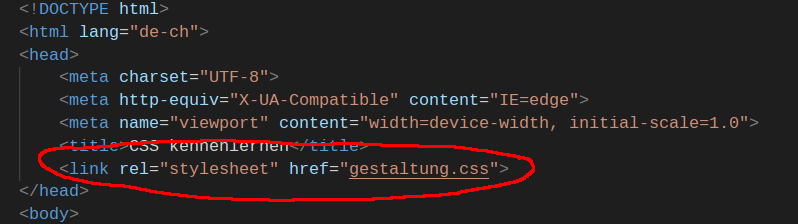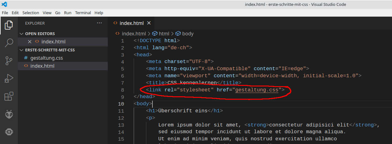 • Dein VS Code-Fenster sollte nun etwa wie der folgende Screenshot aussehen. Damit der Browser später weiss, dass er den Inhalt der HTML-Datei index.html mit Hilfe der CSS-Datei gestaltung.css gestalten soll, ergänze die rot markierte Zeile.