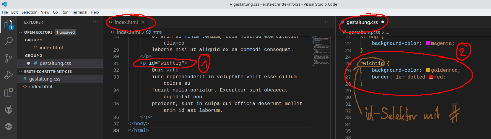 • Stell dir vor, du willst den letzten Absatz (= das letzte p-Element) deiner Webseite besonders hervorheben. Wie im Screenshot mit der (1) rot markiert angedeutet, kannst du diesem Absatz die id (= identity) wichtig geben (formal ergänzt du das HTML-Element p um das Attribut id mit Wert wichtig). Dann wechselst du in das CSS-File gestaltung.css und ergänzt die im Screenshot mit (2) markierten Zeilen.