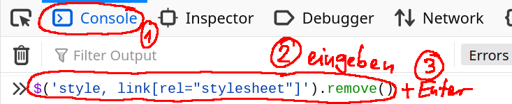 Um nun CSS auszuschalten, dem folgenden “Firefox-Screenshot folgen” (sollte unter Edge ähnlich gehen): (1) auf “Console” klicken, dann (2) per Tastatur rechts von “>>” den angegebenen String eingeben und (3) Enter drücken.