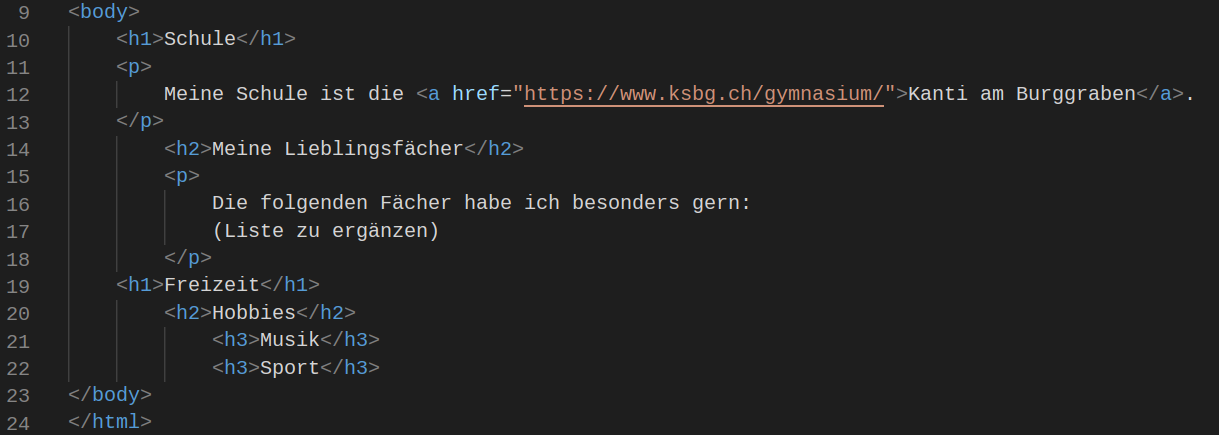 • html mit dem Sprach-Attribut lang=“de-ch”; start tag in Zeile 2, end tag in Zeile 24