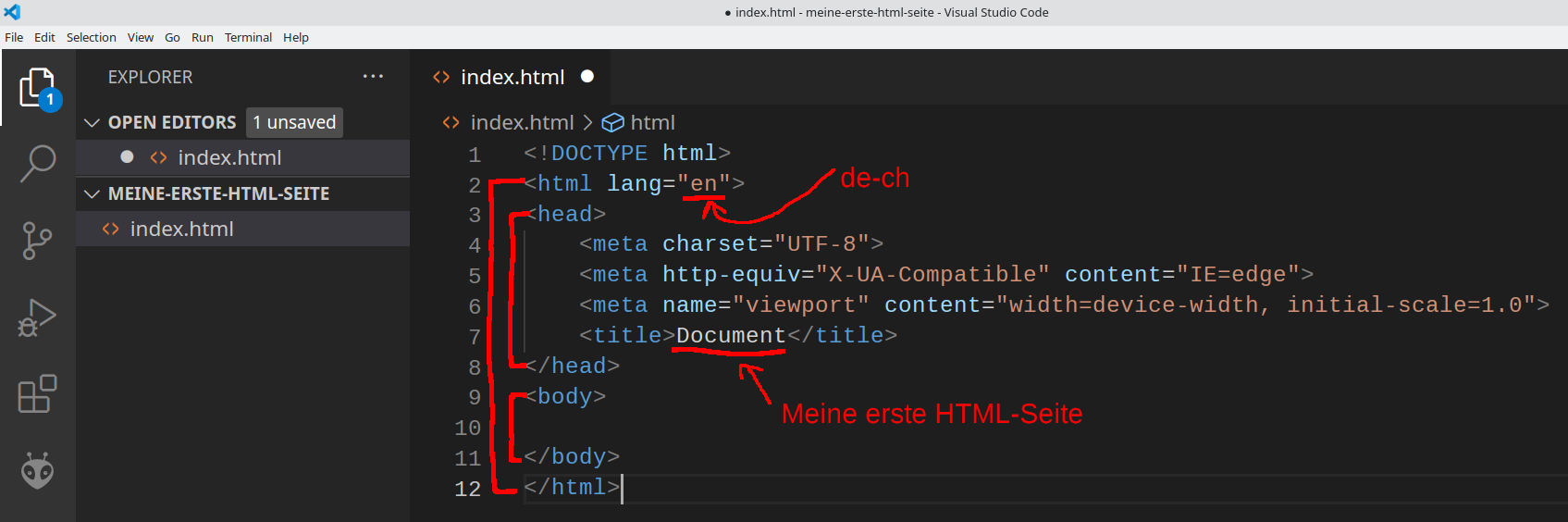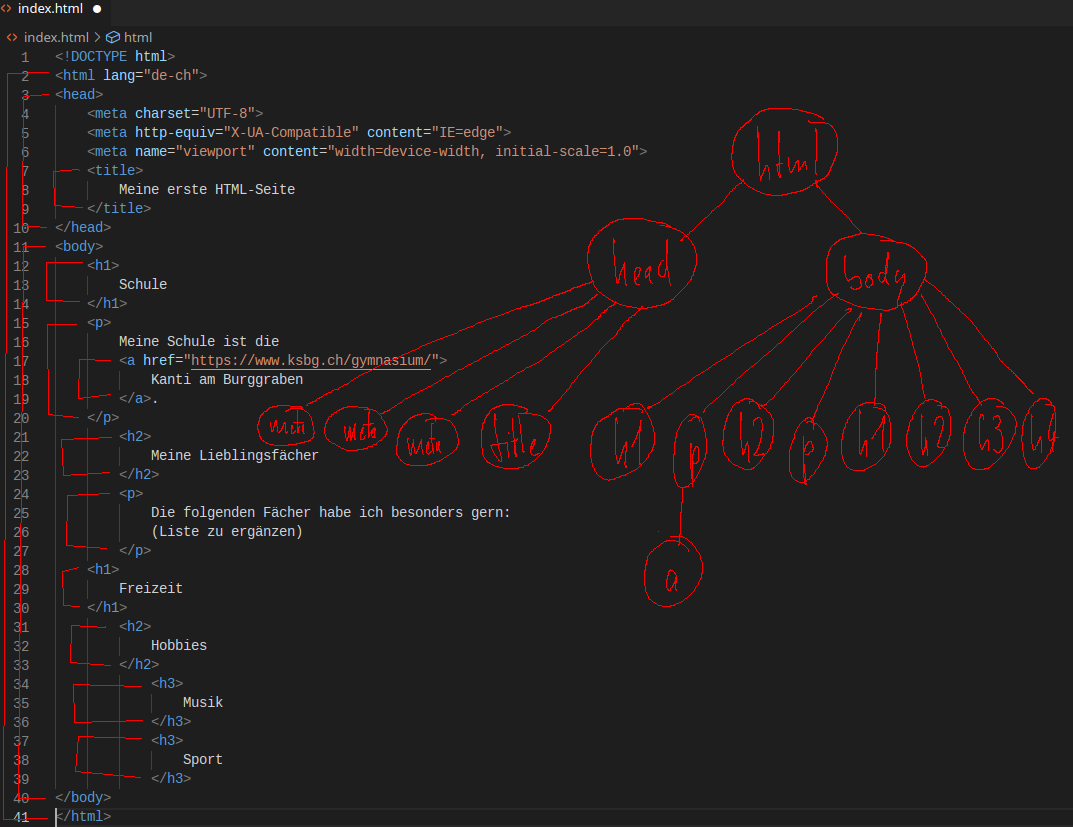 Die erste Zeile <!DOCTYPE html> sagt, dass es sich bei der Datei um eine HTML-Datei in der aktuellen Sprachversion handelt. Der eigentliche HTML-Code befindet sich zwischen den Zeilen 2 und 12 (= grosse rote Klammer von '' bis '' im Screenshot). Dort steht zuerst ein “Head(er)” (= die obere innere rote Klammer von <head> bis </head>) mit allgemeinen Daten (bspw. Titel der Webseite und gewisse “Meta-Daten”, etwa für die sinnvolle Anzeige der Seite auf einem Smartphone). Darunter im “Body” (= die untere innere rote Klammer von <body> bis </body>) folgt der eigentliche (bisher nicht vorhandene) Inhalt der Webseite.