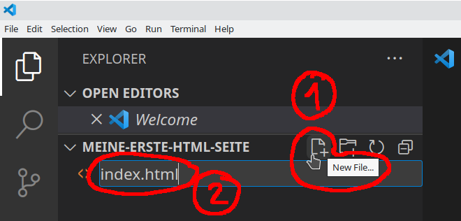• Lege eine neue Datei namens index.html in diesem Folder an: (1) Mausposition wie im folgenden Screenshot, entsprechenden Icon anklicken, (2) index.html eintippen und Enter drücken.
