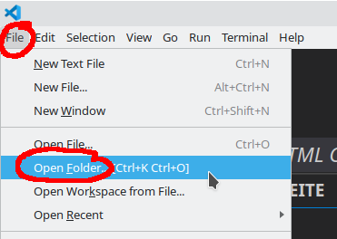 • Öffne den gerade erstellten Ordner meine-erste-html-seite, z. B. über das Menü per FileOpen Folder: