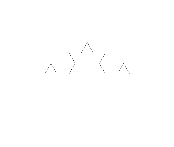 Schreibe eine rekursive Funktion kochkurve(level, a), die je nach “Level” die folgenden Bilder zeichnet (alle Winkel sind entweder $60^\circ$ oder $120^\circ$; die Turtle soll jeweils links starten und rechts ihren Weg beenden, jeweils mit Blickrichtung nach rechts (und nicht wie beim “Baum” zum Ausgangspunkt zurückkehren); ACHTUNG (machen erfahrungsgemäss viele sonst anders): Der Anfangspunkt der Turtle soll vom Endpunkt immer (unabhängig vom Level) dieselbe Distanz haben; wenn man diese Kurve “unendlich genau” zeichnet, bekommt man die sogenannte Koch-Kurve):