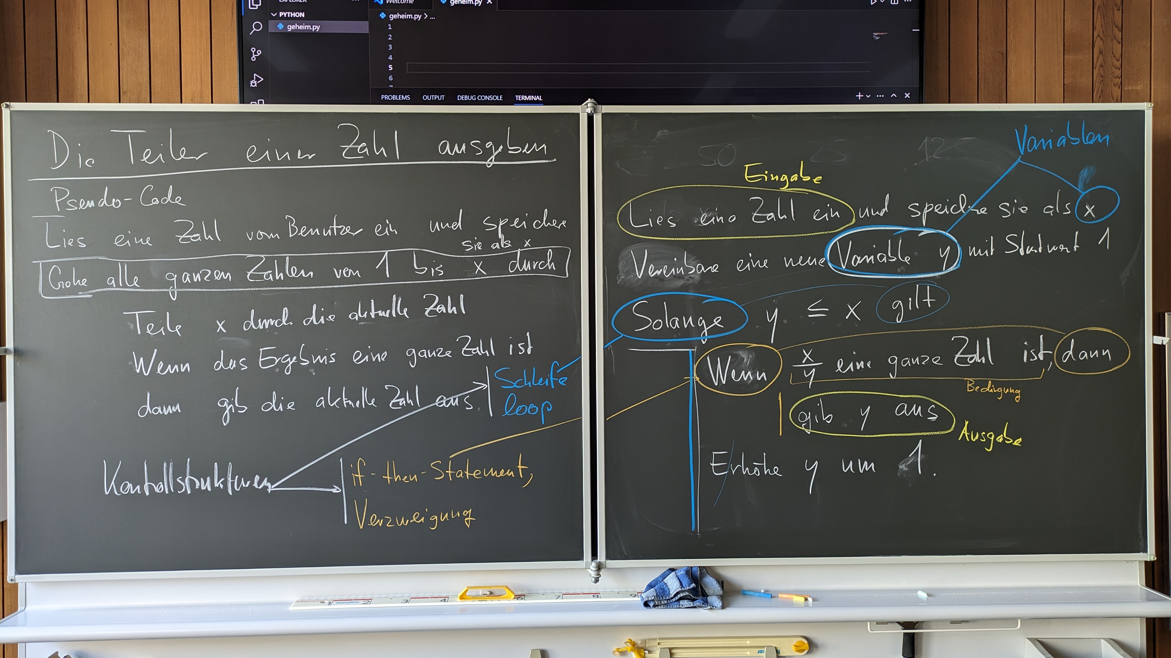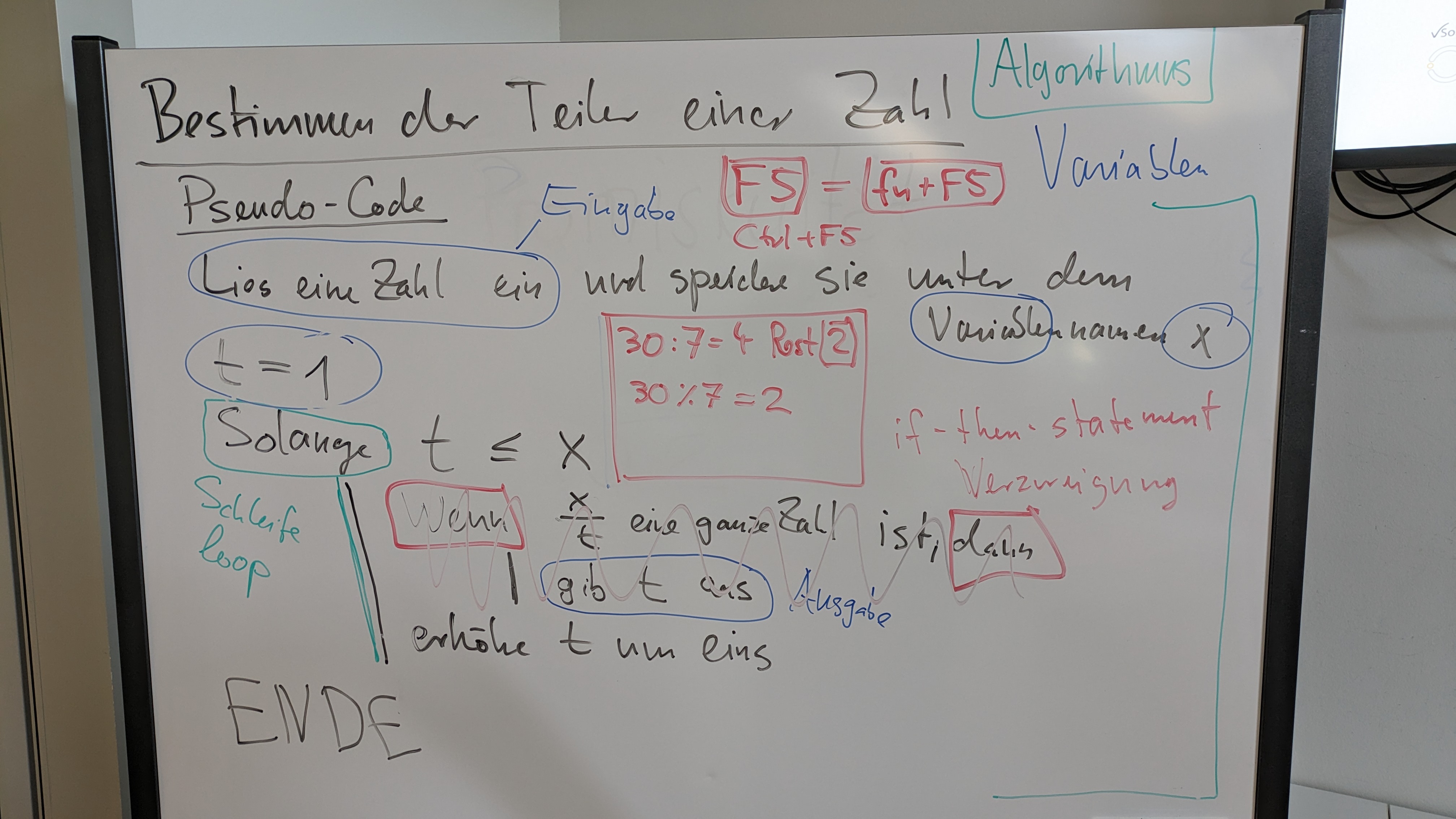 Ziel: Ein Python-Programm schreiben, das alle Teiler einer Zahl ausgibt. (Ich habe das nicht sichtbare Programm vorgeführt.)