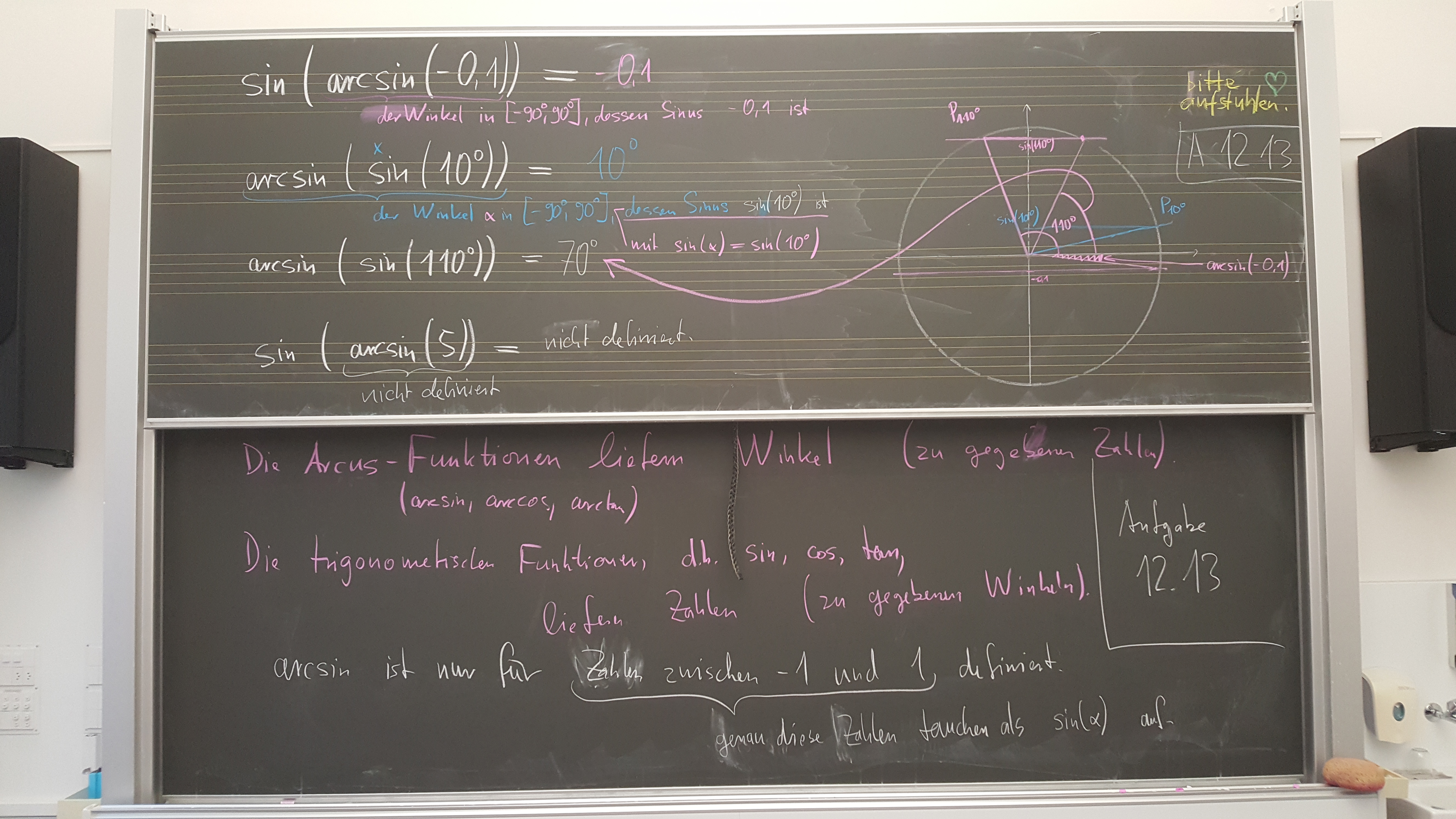 Wissen: Definitionen der Arcusfunktionen (Arcus-Sinus, Arcus-Cosinus, Arcus-Tangens), wie die Graphen dieser Funktionen aussehen; wie eine harmonische Schwingung mathematisch beschrieben wird.