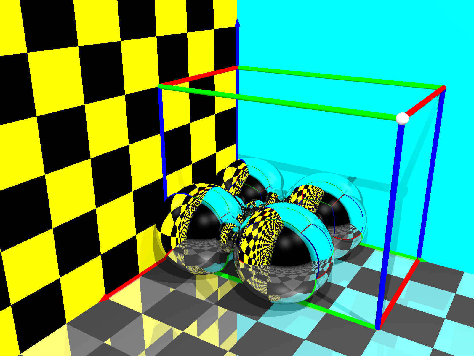 Lege eine verspiegelte Kugel in die “Ecke” unseres Koordinatensystems, indem du das soeben erstellte Programm am Ende um die folgenden Zeilen ergänzst: