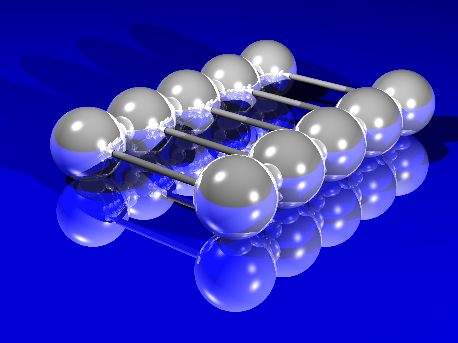 Bonus: Lege eine weitere verspiegelte Kugel in die Mitte zwischen die vier Kugeln. Hinweis: $\sqrt{2}$ bekommst du per sqrt(2).