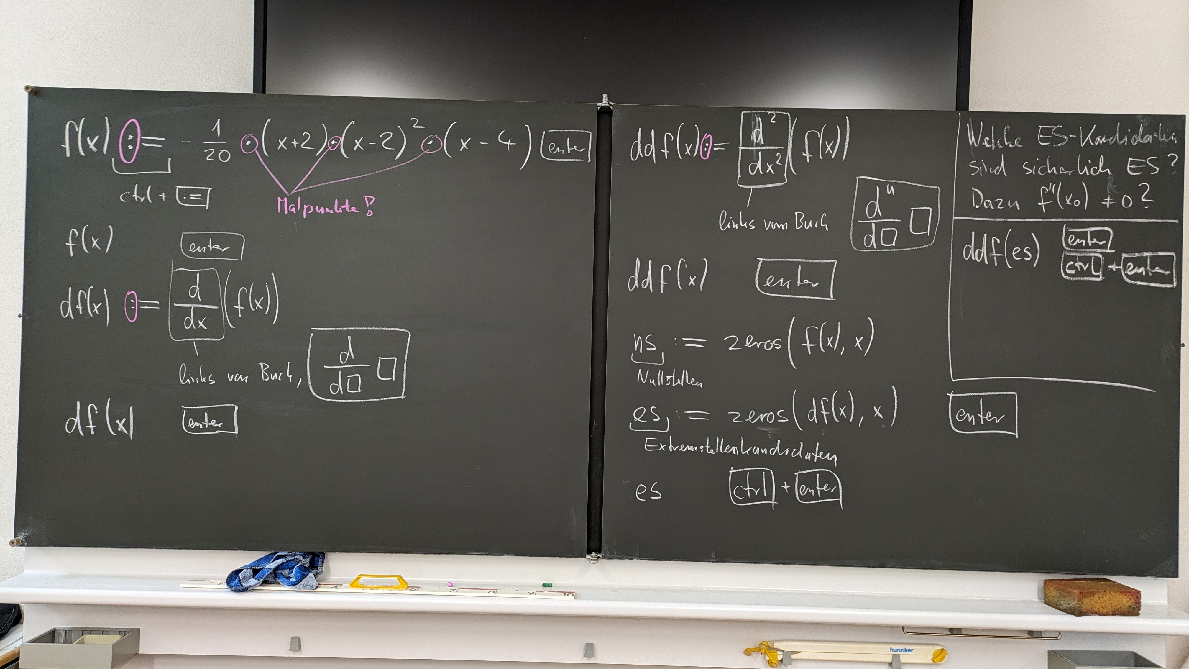 - Ableitungen berechnen können; wer sich auf den Taschenrechner verlassen möchte, sollte dies üben (vgl. Tafelfotos auf dieser Seite; mit Ctrl-Enter bekommt man gerundete Ergebnisse)